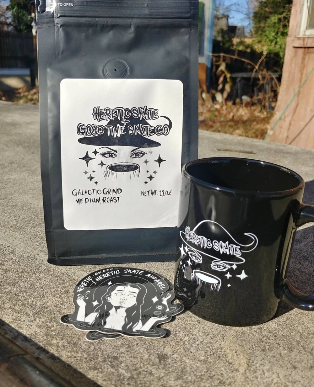 In collaboration with Good Time Skate Co. and Roastology we bring you our small batch coffee blends! First up we have our Galactic Grind, a light roast with hints of orange, vanilla, and caramel. This coffee is both organic and fair trade, packaged in 12 oz. pre-ground bags. Our art for this project comes from Alyssa Polzin (@elvencreation) who has created so many amazing products for the Heretic family!